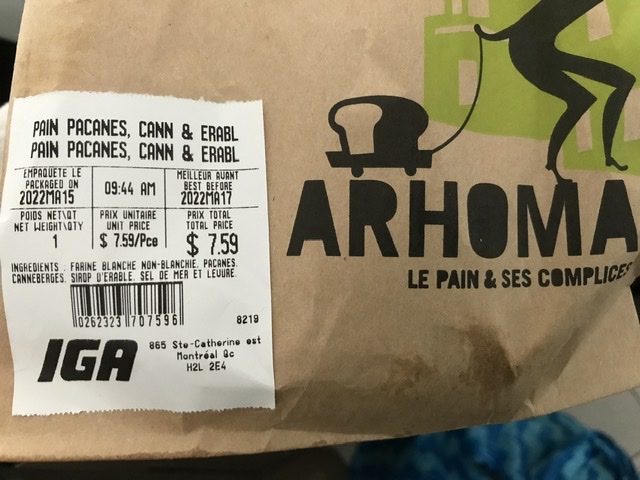 This pretty loaf was very tasty, but not of maple. Looking at the label, seems like maple syrup was used instead of sugar as food for the levure, or yeast, but it did not result in maple-flavored bread.