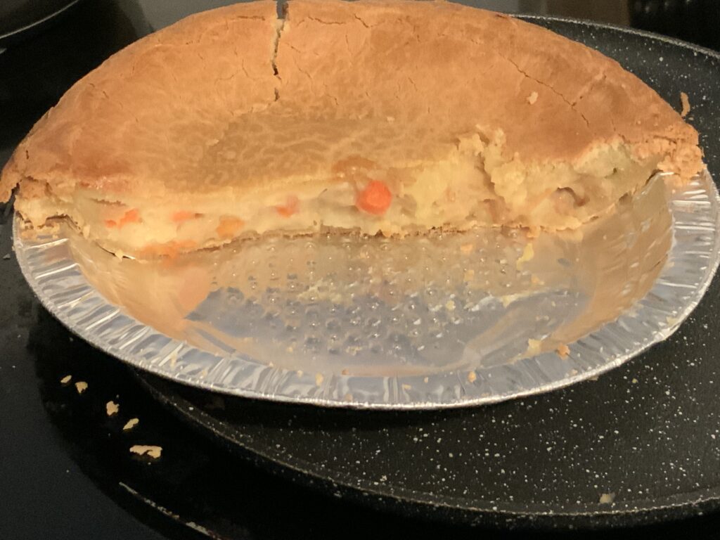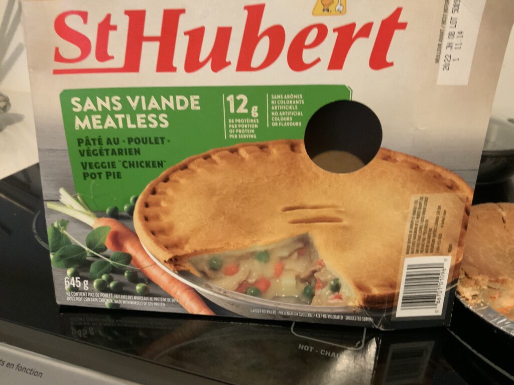 We admit it: we’ve been buying some convenience food here and there to keep on hand when we’re not up to cooking (and that came in handy when we had la grippe last week). Pot pies and tourtières are a staple here in Québec, so we thought we’d try this vegetarian “chicken” pie.