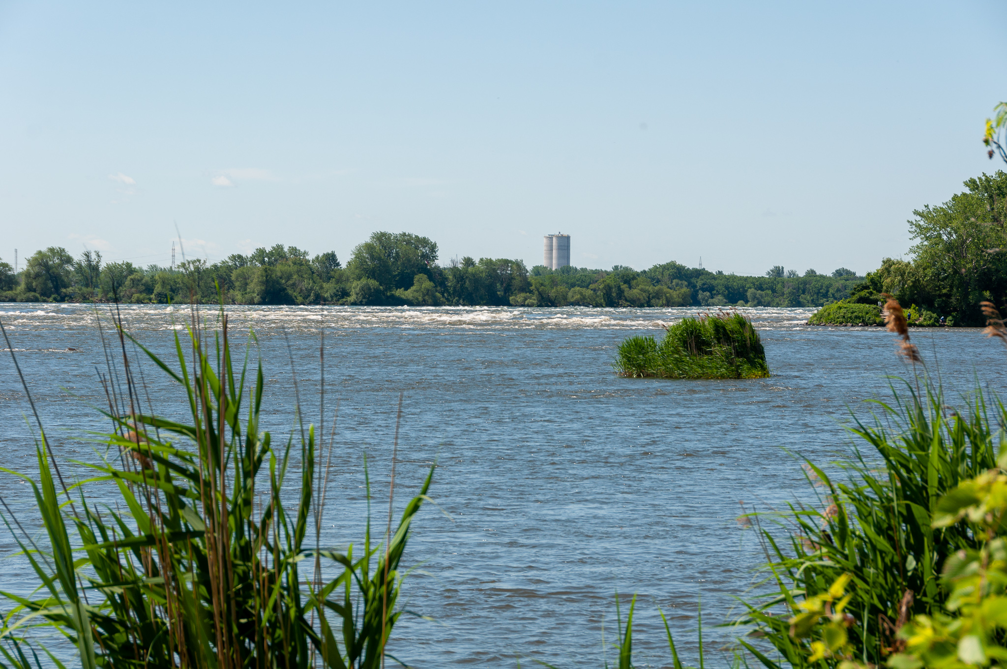 Down at the south-east point of the Isle of MontrĂ©al, the St. Lawrence river goes over a series of rock shelves creating the Lachine Rapids. Early European vistors like Jacques Cartier thought the St. Lawrence was the fabled Northwest Passage, but the rapids stymied their forward progress — nearly a hundred years passed between their initial encounter with the rapids and the time when European explorers continued their exploration of the river beyond.