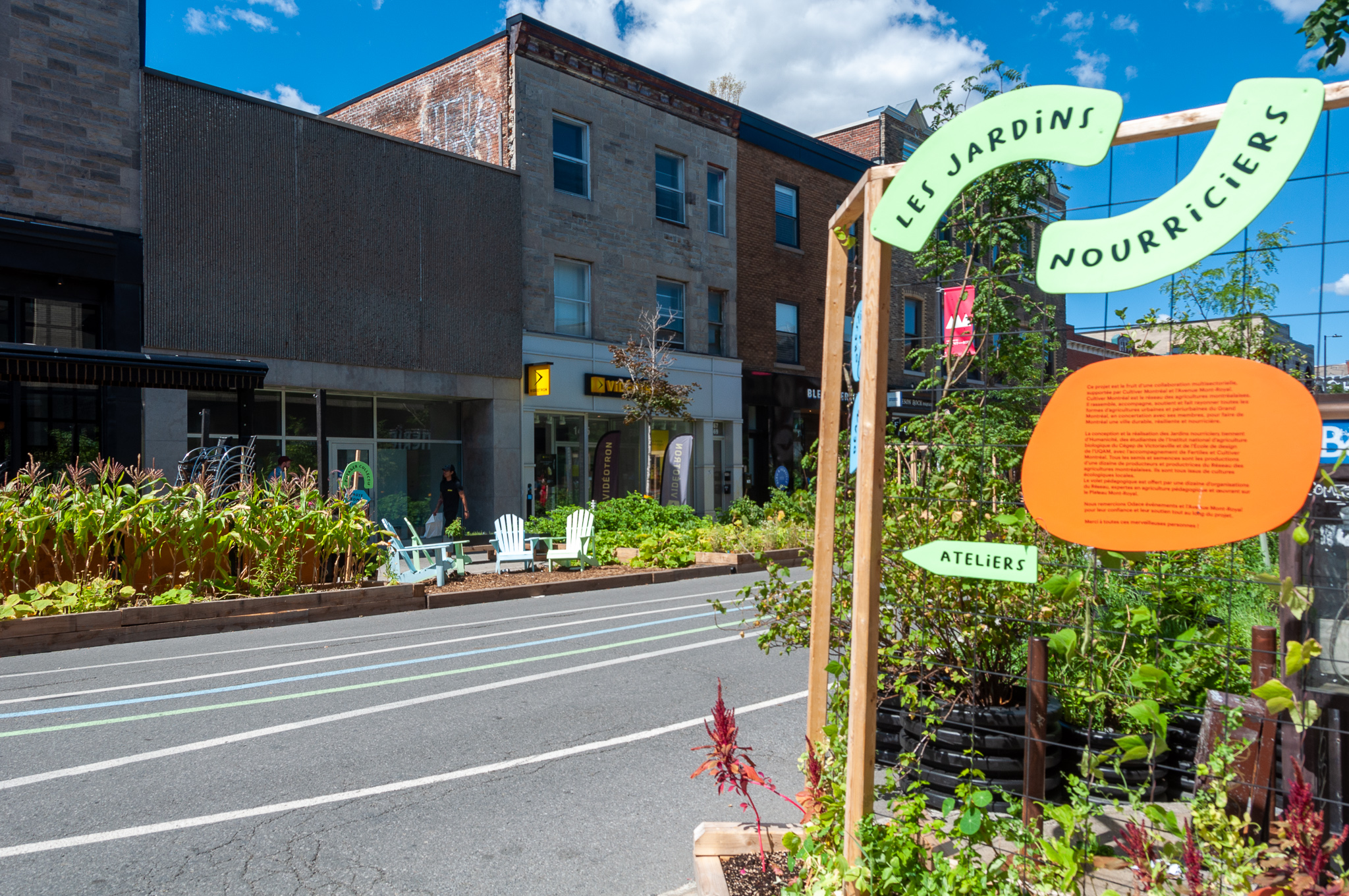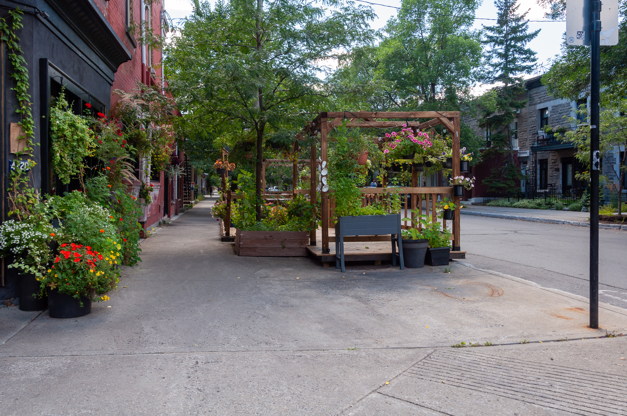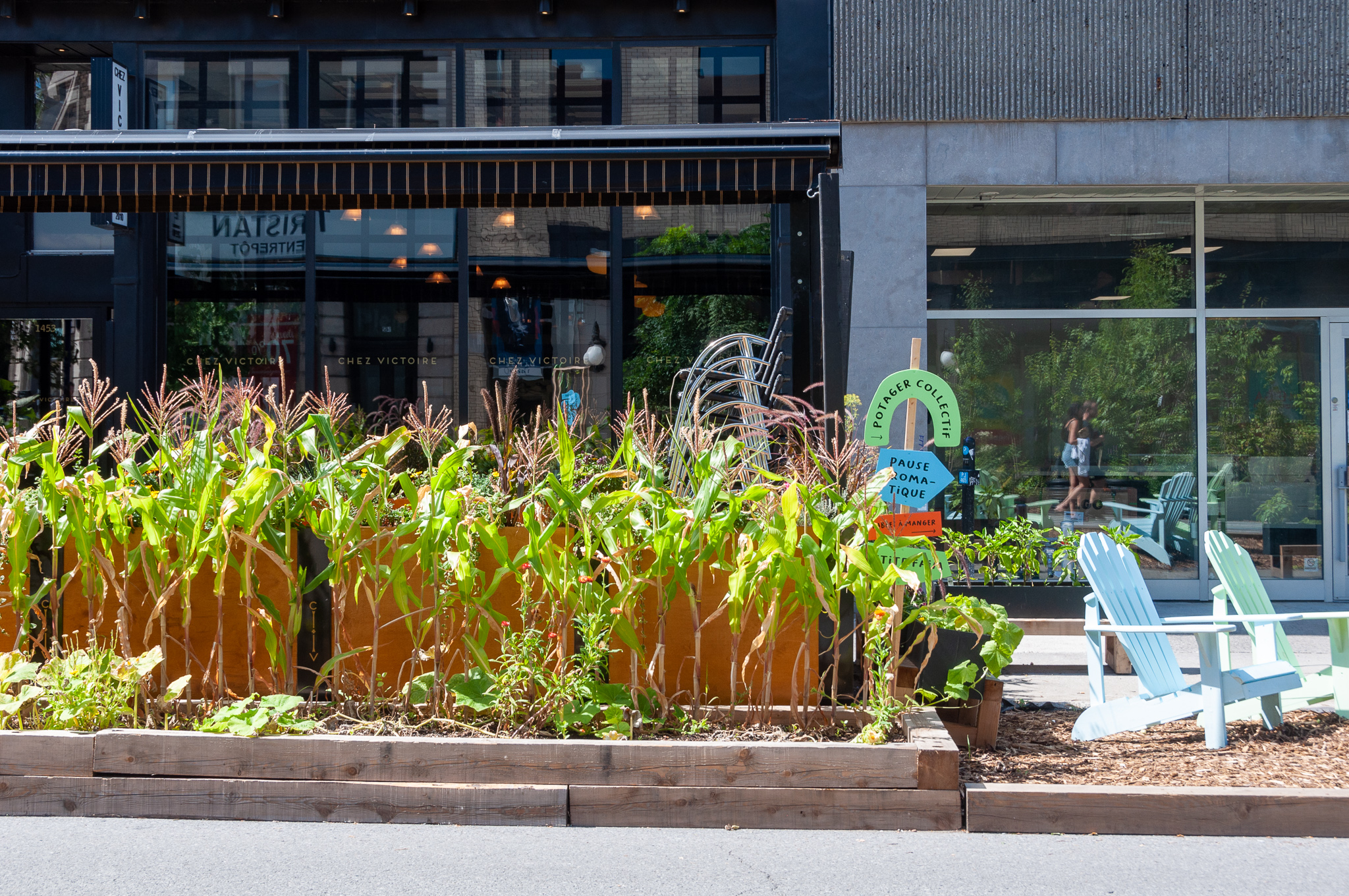 I started going up through Parc La Fontaine, and strolled a bit along Rue Mont-Royal which is now a walk street. Remember the planter with edible plants that Manon photographed out in front of our building? Well, on Rue Mont-Royal they have full “Gardens of Nourishment” with squash, tomatoes, herbs, and … corn!