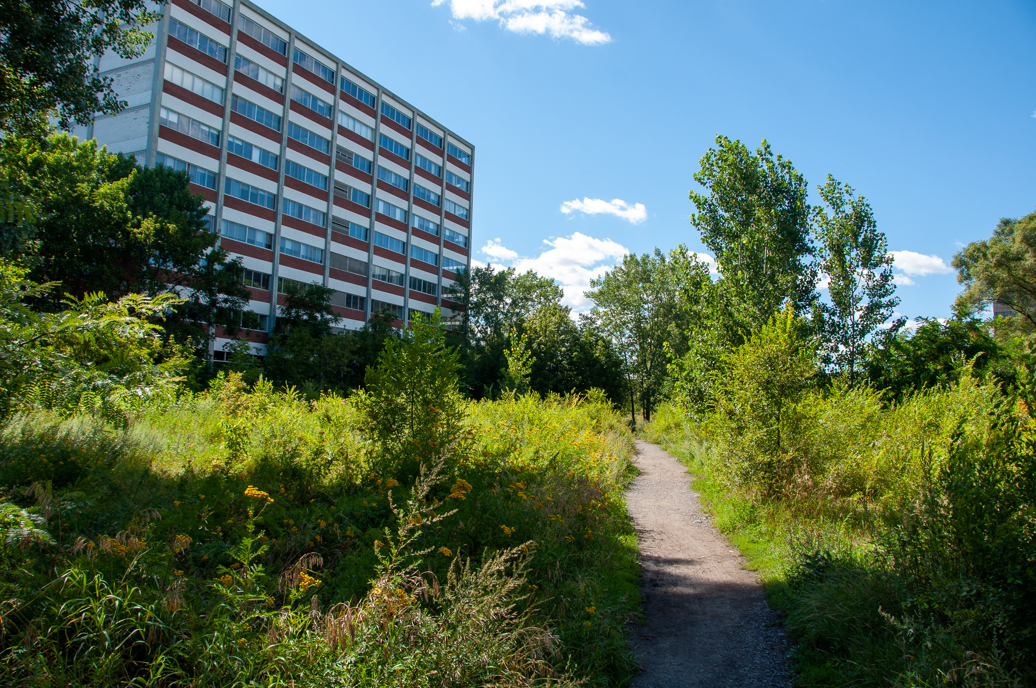 My progress westward, however, was stopped by some big buildings. This complex houses Ubisoft, among other things. Behind the buildings, there’s a wild corridor, and a dirt path that eventually took me to other streets where there was a busy skatepark.