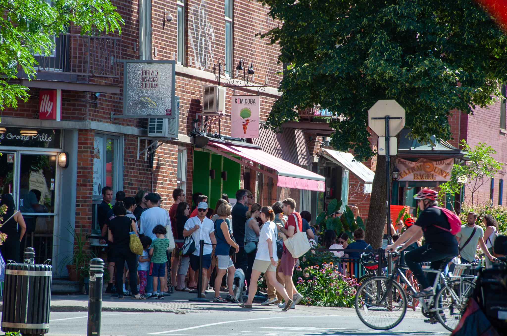 Mile End seems to be a very happening neighborhood. Some stretches, like along Parc avenue, have a lot of shuttered buildings but among them were also fruit markets with a dazzling array of berries (not sure what happened to the photo I took there, but it’s gone). Meanwhile, along Bernard Avenue and Saint-Viateur and Saint-Laurent, there were crowds of youngsters with ice cream, orthodox Jews in big fur hats, people shopping in boutiques, and tourists like me. Coffee joints were hopping, and several pubs and wine-bars were doing brisk business. The famous bagel joints (Fairmount and St. Viateur) both had lines outside.