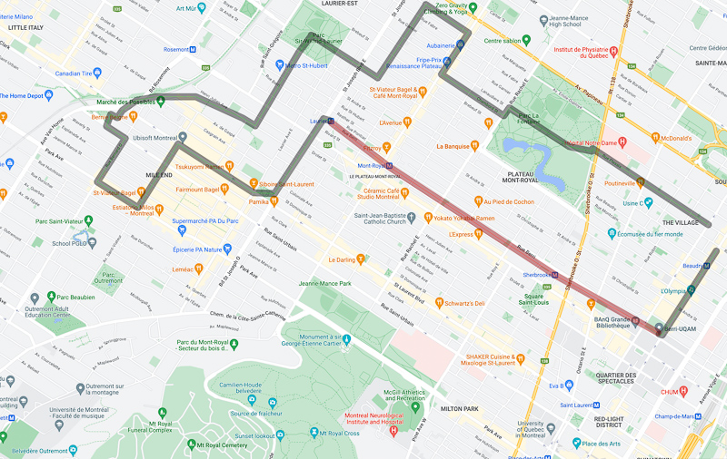 From the busy walk street, I wended my way gradually westward, through the beautiful shady streets of Le Plateau. After a while, between the buildings, I could glimpse the north side of the Mont!
