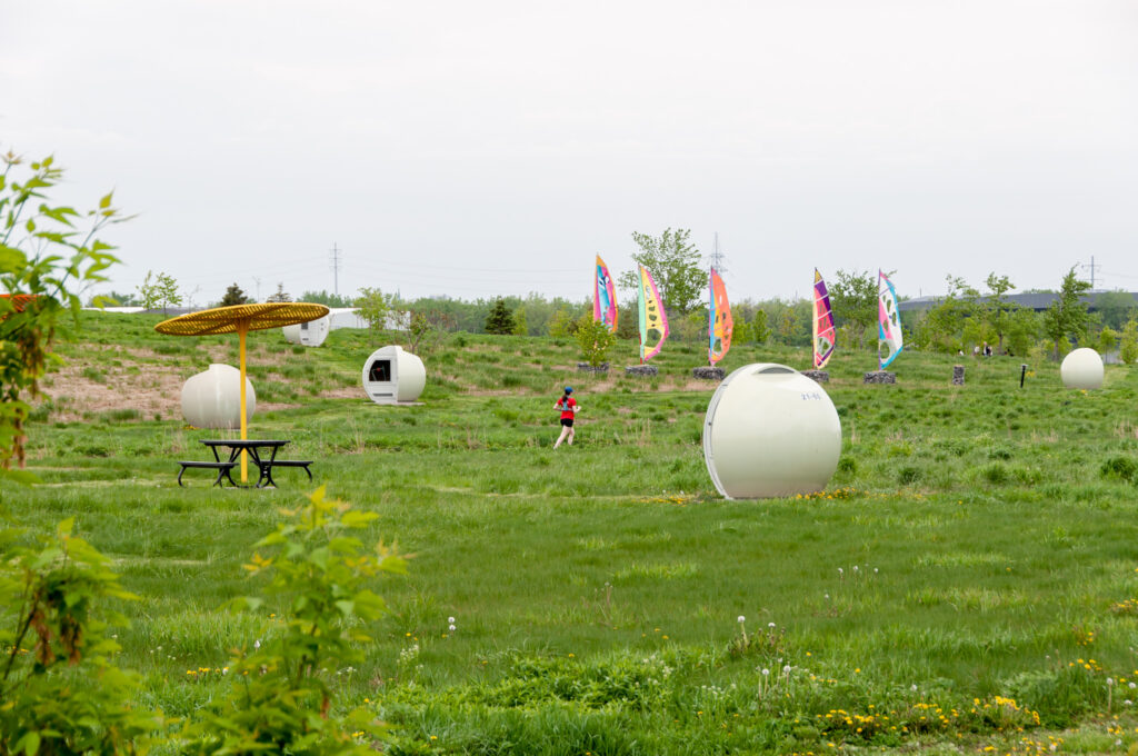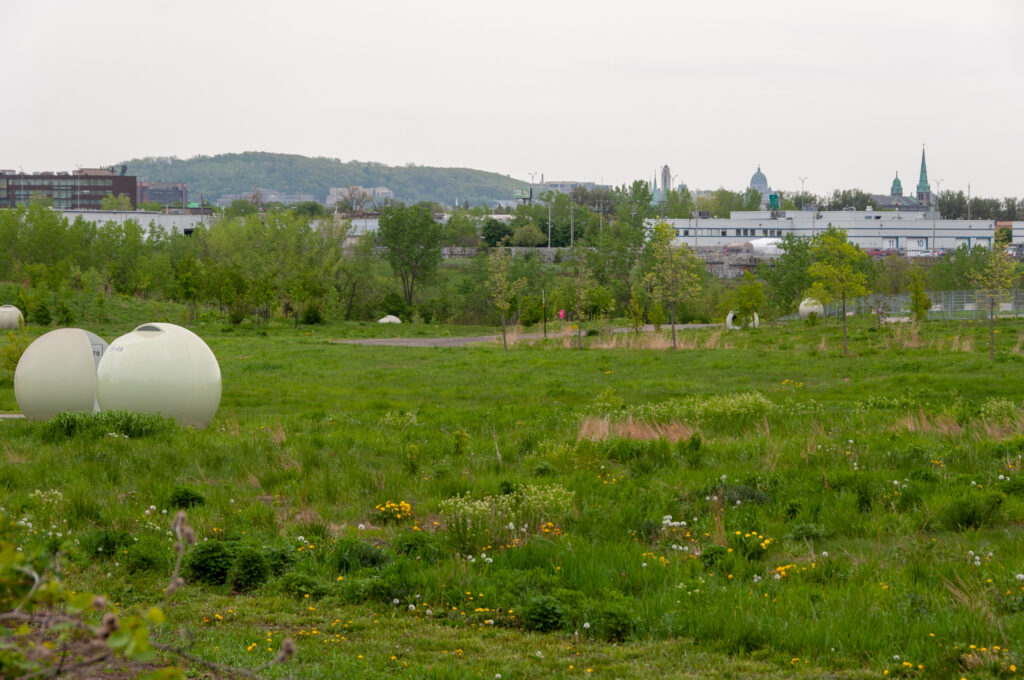 On my ride, I passed through the Parc Frédéric-Back. This was once a rock quarry and landfill, and in recent years is being converted into a huge park and ecological preserve. It’s got a big recycling center, miles of bike/walking trails, a skate-park, the TOHU Cité des Arts du Cirque circus complex (and just outside the park, Cirque-du-Soleil has what I believe is their HQ, dorms, and fabrication facilities). There’s also a big biogas facility, that converts the off-gassing of the landfill into electricity, and the landscape is dotted with sci-fi spherical covers for the wells.