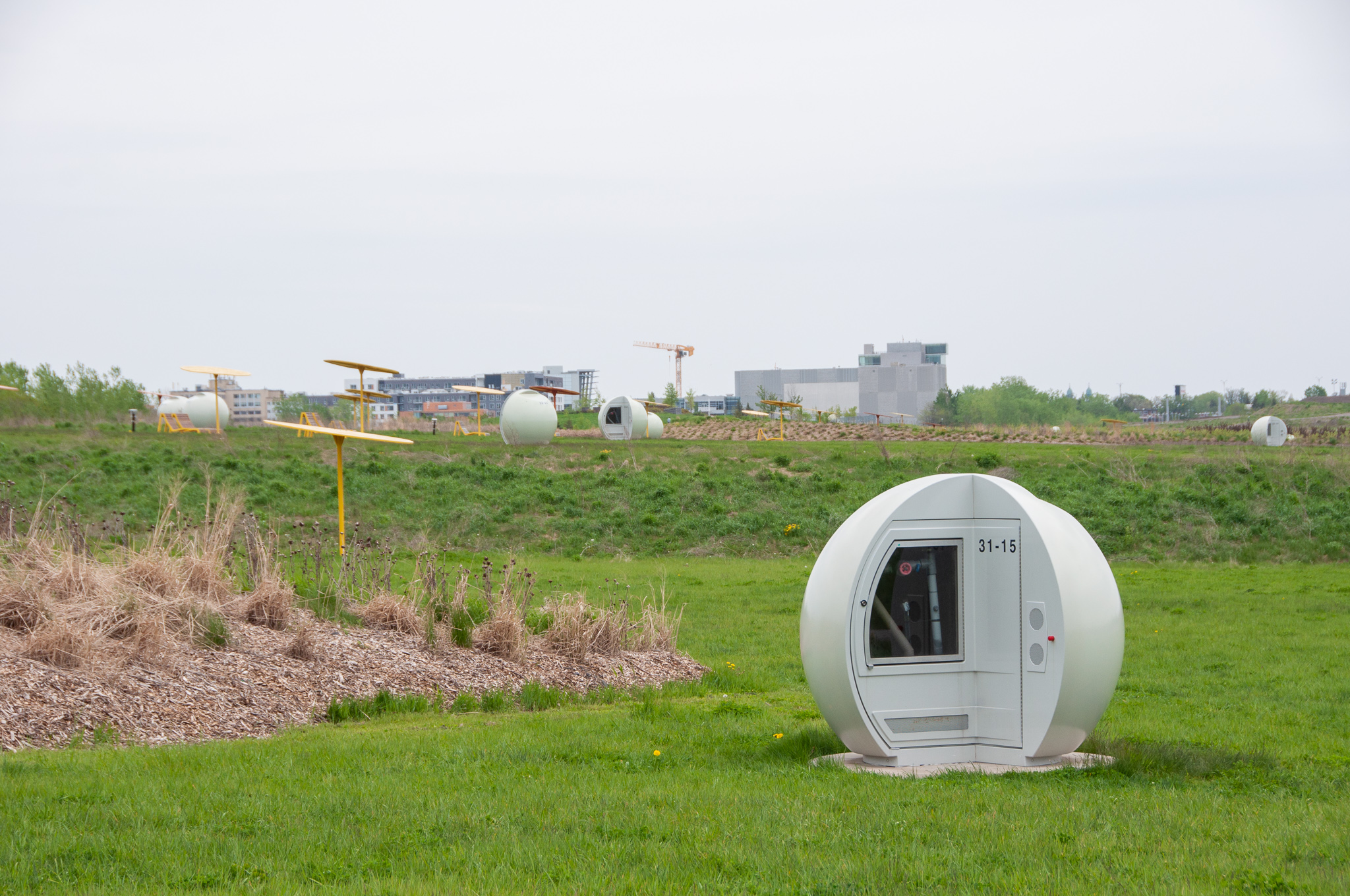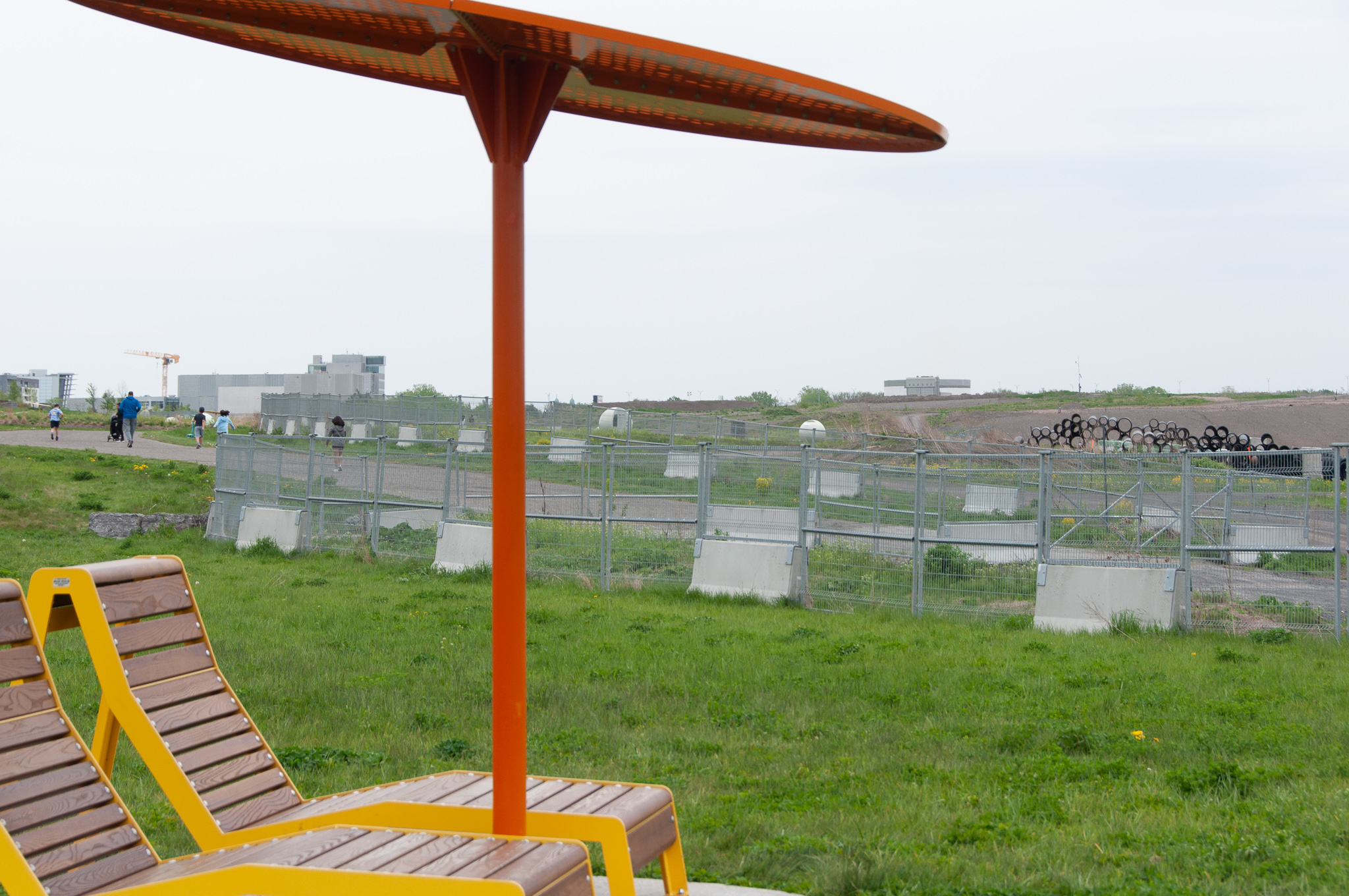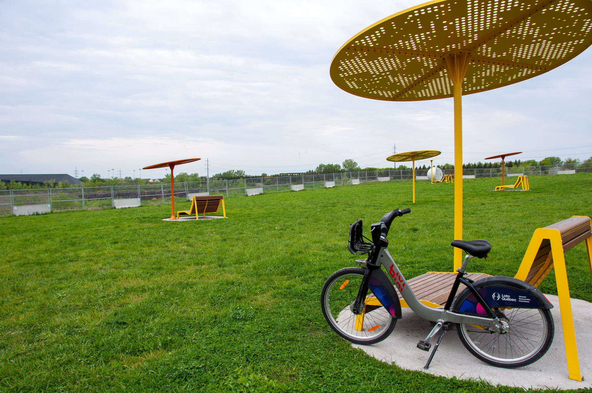 On my ride, I passed through the Parc Frédéric-Back. This was once a rock quarry and landfill, and in recent years is being converted into a huge park and ecological preserve. It’s got a big recycling center, miles of bike/walking trails, a skate-park, the TOHU Cité des Arts du Cirque circus complex (and just outside the park, Cirque-du-Soleil has what I believe is their HQ, dorms, and fabrication facilities). There’s also a big biogas facility, that converts the off-gassing of the landfill into electricity, and the landscape is dotted with sci-fi spherical covers for the wells.