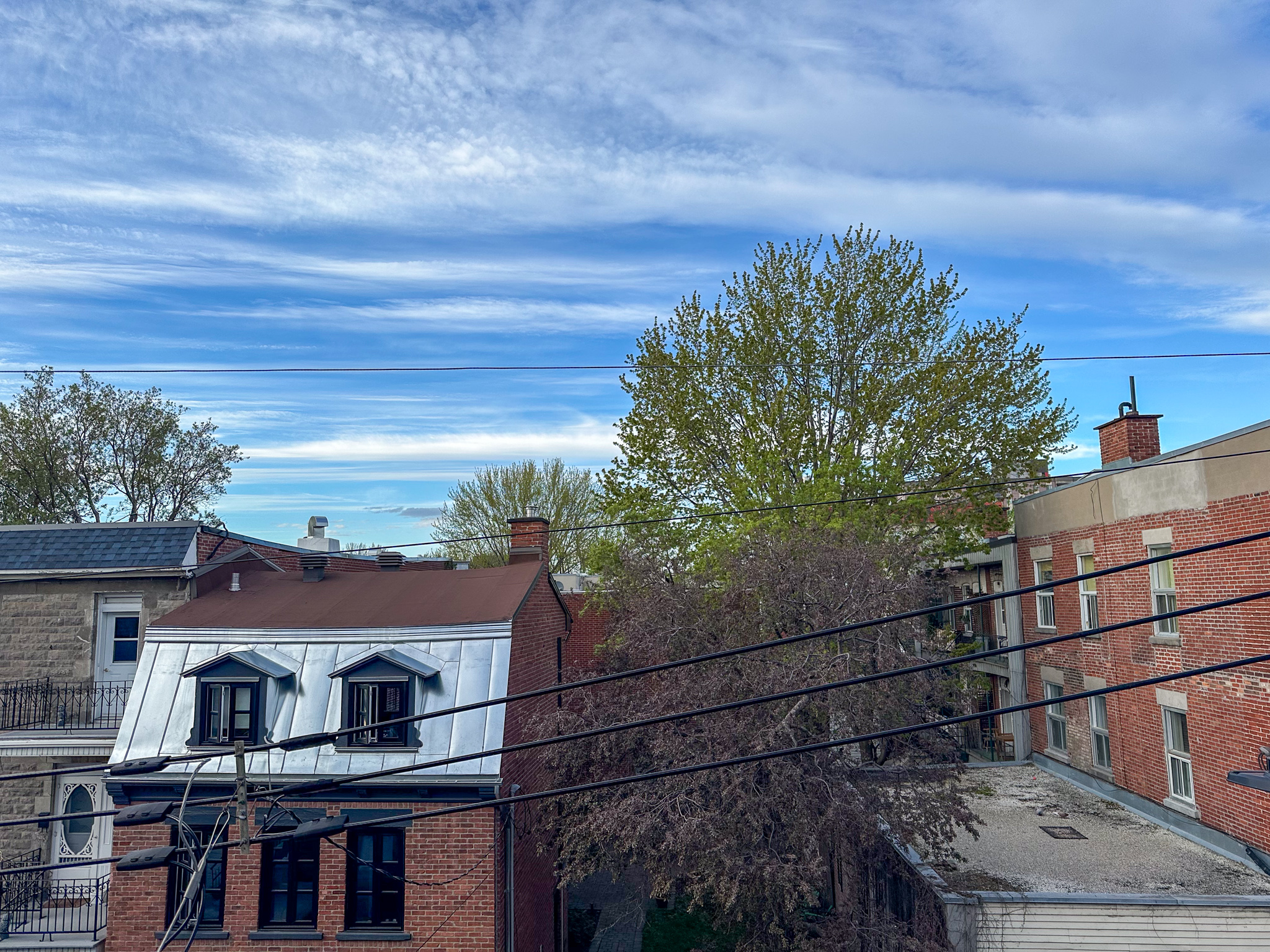 From the front-facing window and small balcony at the apartment, there’s a view of the street below and the shaded courtyard of the house across. When we first arrived, the trees were mostly bare or just beginning to leaf out.