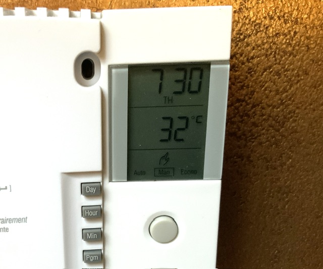 There’s one animal you definitely won’t find in the streets today though–ME. This is our third day of extreme chaleur (heat) and it’s getting tougher to withstand. Here’s a pic of the living room thermostat at about 7am: