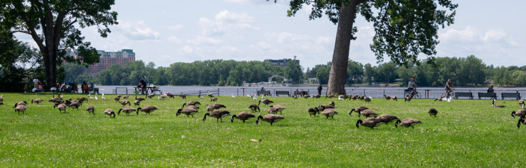 The trail returned the woods before merging back with the trail I had been on earlier at an intersection I hadn’t noticed on my way in. It was time to head back. Only one problem — there were no bikes at the Bixi station. So I walked further than I intended over to the next-closest Bixis at Parc de Beauséjour. There, I ventured across the lawn to take a look at the Prairie River, and found it well-defended — although, contrary to popular depiction, these dinosaurs were pretty mellow, and didn’t seem to object to people walking amongst them.