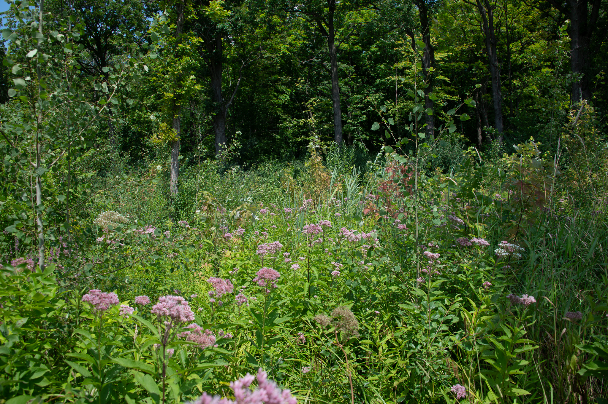 The trail ends on another street of big houses, and I continued along the street until I found another gravel path back into the woods. This path paralleled the previous one, and after a while wound through some fields of Joe-Pye weed, goldenrod, and purple loosestrife, where I met a familiar friend.