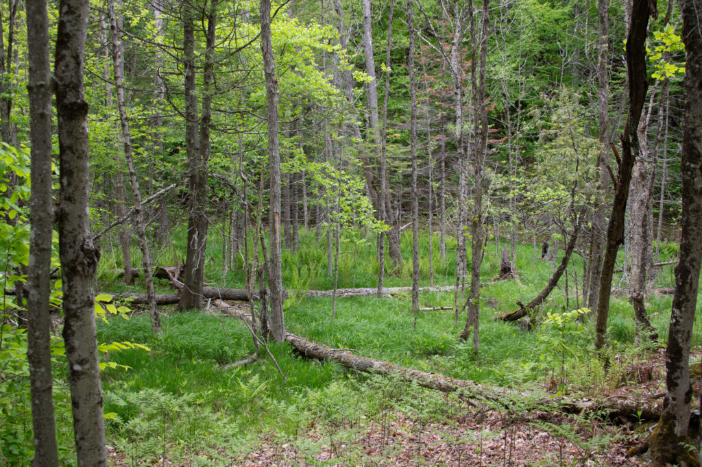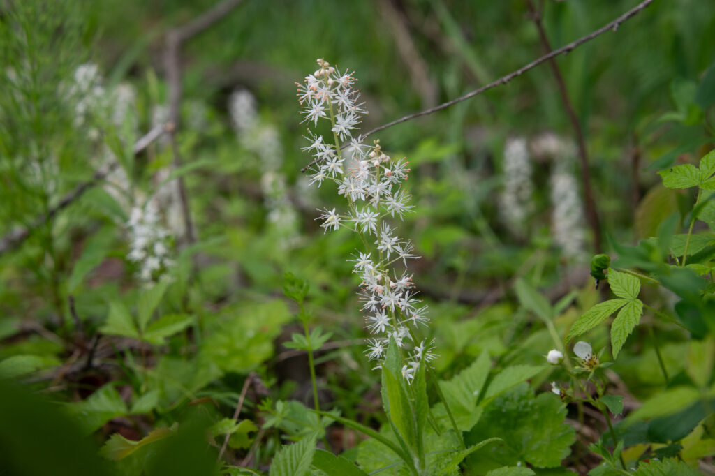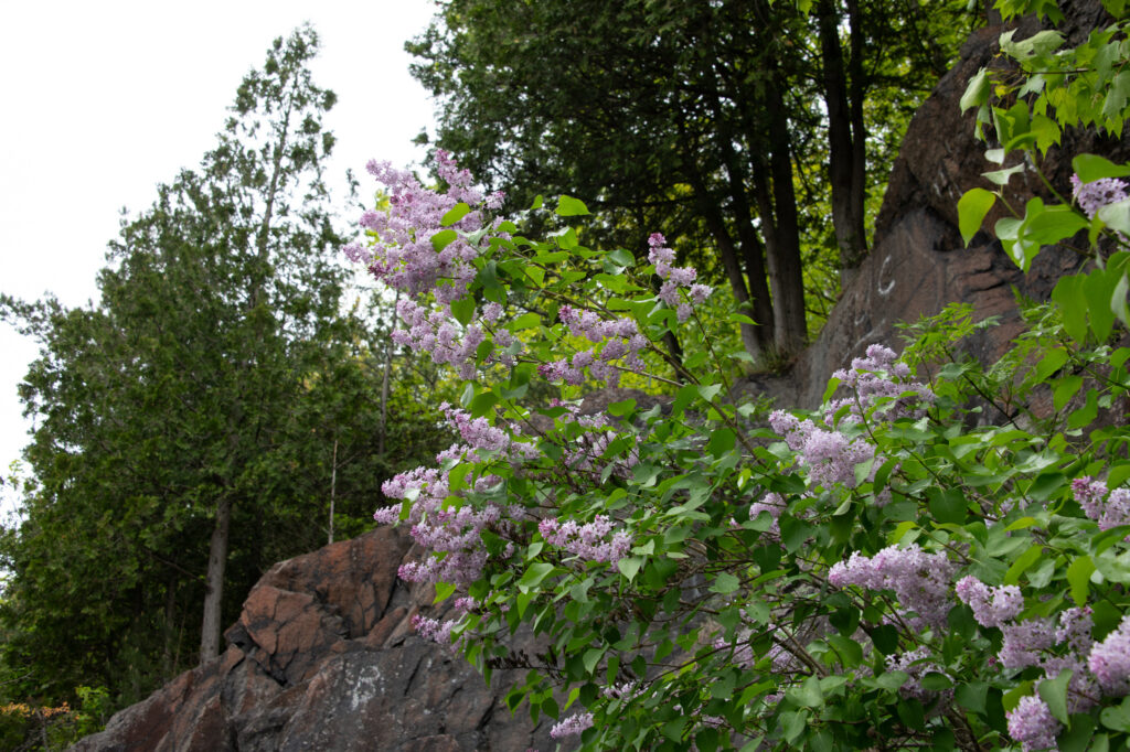 I went walking along the multipurpose path of the P’tite Train, which took me along the banks of Lake Mercier and through woods of a different sort than I’m accustomed to in Montreal. What’s not immediately obvious on the trail is that it’s largely passing through the back yards of homes (or perhaps summer homes) ranging from quaint mountain cottages to massive classical chateaux or modernist mansions. But between these houses, there are areas of woods and rough drainages that are filled with trees, shrubs, and flowers.