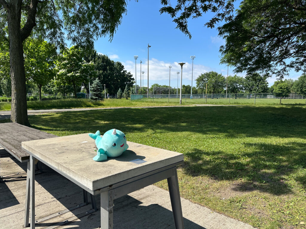 I’m afraid I don’t know. It was sitting happily on the table when I wandered the park early on a Sunday morning. I don’t know if it was accidentally left there the night before, or if it lives there. I suppose I should go and check on it again!