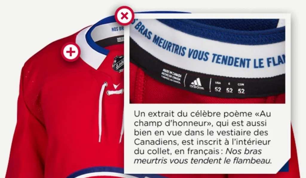 However, the pricey jerseys have a spiritual advantage over mere logo-wear–inside the back collar there is an inscription in French: “Nos bras meurtris vous tendent le flambeau” (“to you from failing hands we throw the torch“), a line you may recognize from “In Flanders Fields,” the iconic war poem written by Canadian John McRae.