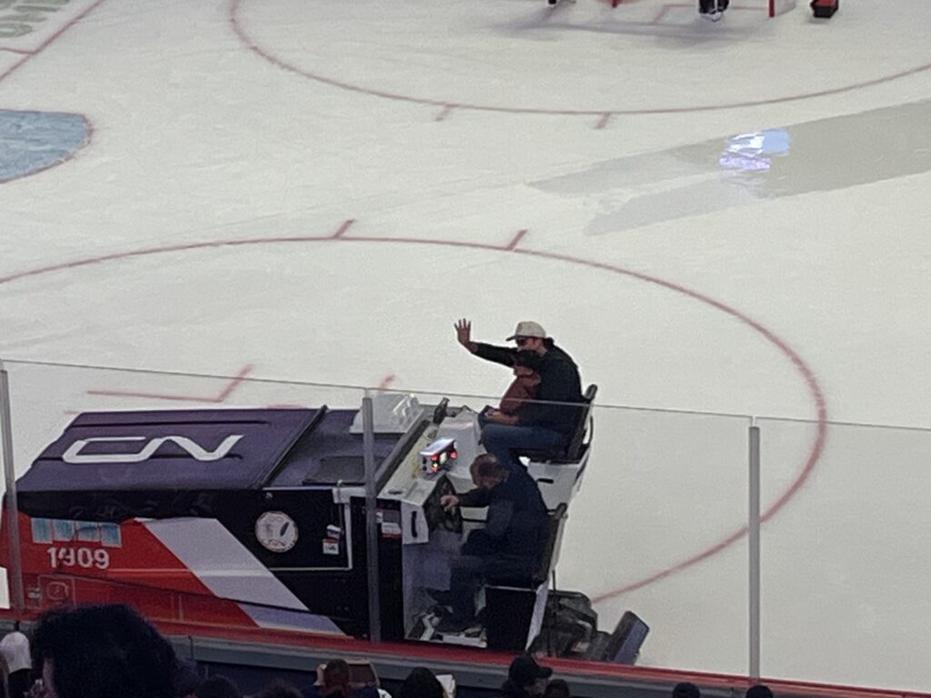 Each period there were different people riding shotgun on the Zamboni; mostly kids, but this guy had a blast (he also had a kid on his lap for show)
