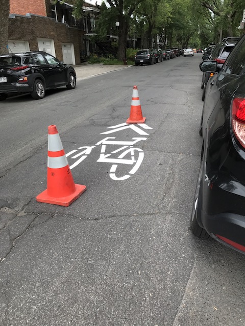A truck just came by and quickly spray-painted this “sharrows” symbol on the street, right in front of our condo.